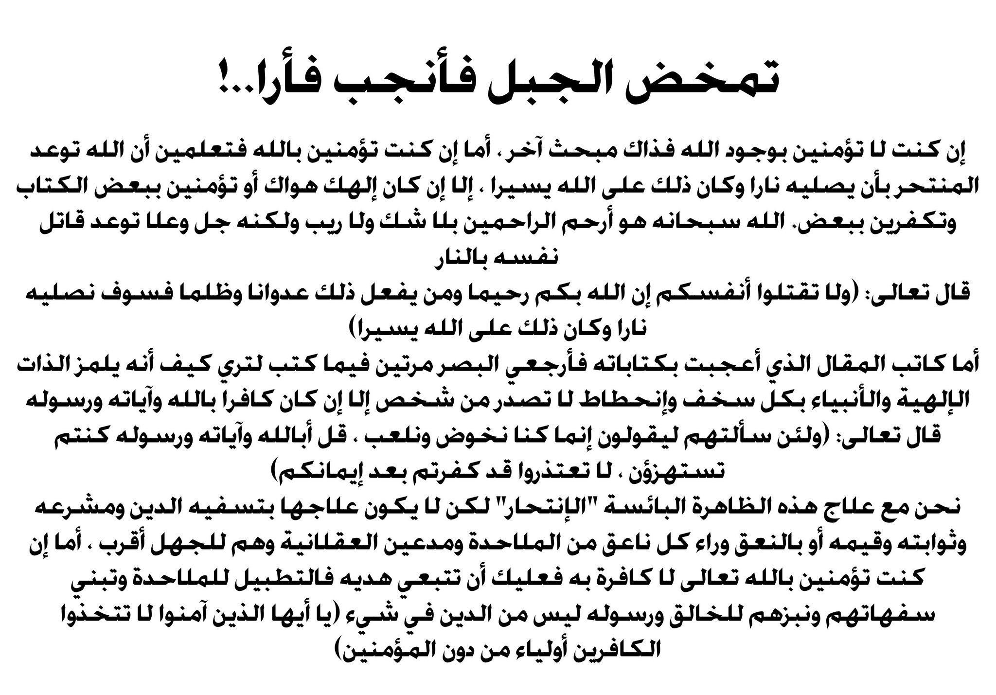 على طريق هداية No Twitter تمخض الجبل فأنجب فأرا قال تعالى ولا تقتلوا أنفسكم إن الله بكم رحيما ومن يفعل ذلك عدوانا وظلما فسوف نصليه نارا وكان ذلك على الله يسيرا Https T Co Adng1qyoli